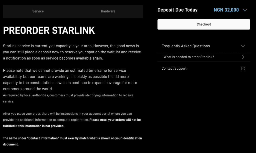 In some parts of Nigeria, particularly high-demand locations such as Victoria Island, Ikoyi, Lagos Island, Surulere, Lekki, and specific areas of Abuja, Starlink has temporarily paused new Residential Plan orders due to network congestion and capacity limitations. When you try to place an order from these areas, Starlink now displays a message stating that service is at capacity.